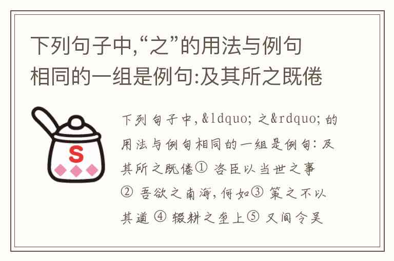 下列句子中,“之”的用法与例句相同的一组是例句:及其所之既倦① 咨臣以当世之事 ② 吾欲之南海,何如③ 策之不以其道 ④ 辍耕之垄上⑤ 又间令吴广之次所旁丛祠中 ⑥ 曾不知老之将至 A. ②③⑤ B. ②④⑤ C. ①④⑥ D. ①③⑥