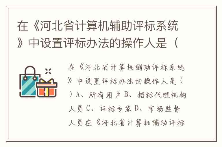 在《河北省计算机辅助评标系统》中设置评标办法的操作人是()A、所有用户 B、招标代理机构人员 C、评标专家 D、市场监督人员