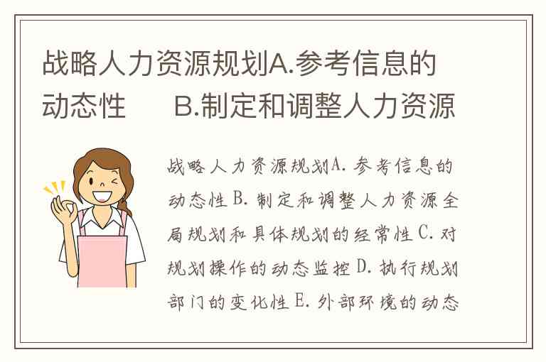 战略人力资源规划A.参考信息的动态性 B.制定和调整人力资源全局规划和具体规划的经常性 C.对规划操作的动态监控 D.执行规划部门的变化性 E.外部环境的动态变化