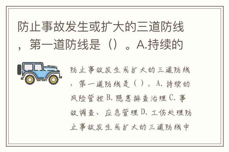 防止事故发生或扩大的三道防线,第一道防线是()。A.持续的风险管控 B.隐患排查治理 C.事故调查、应急管理 D.工伤处理