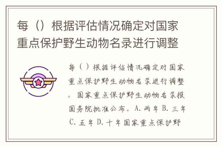 每()根据评估情况确定对国家重点保护野生动物名录进行调整。国家重点保护野生动物名录报国务院批准公布。A.两年 B.三年 C.五年 D.十年