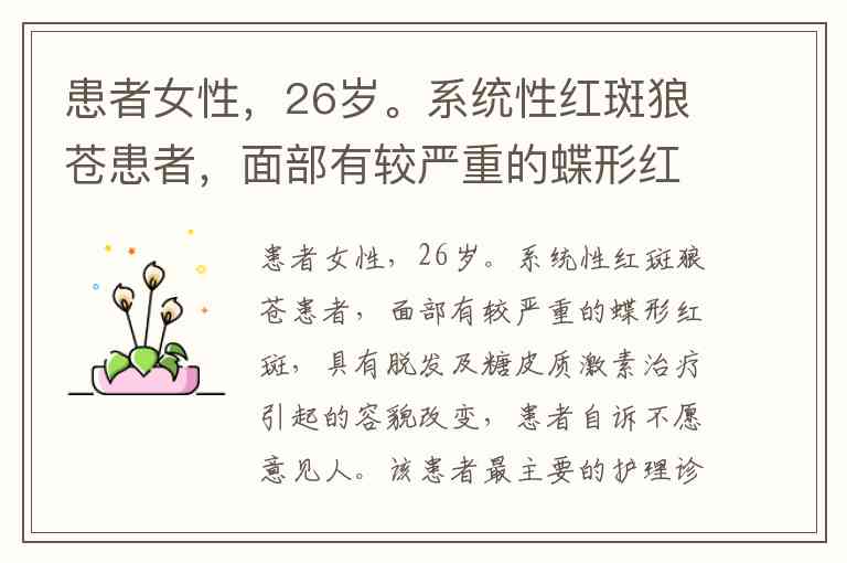 该26岁系统性红斑狼疮女性患者因面部蝶形红斑、脱发及激素治疗导致的容貌改变而产生社交回避,这直指核心护理问题——自我形象紊乱。系统性红斑狼疮患者中约80%会出现皮肤损害,其中颊部蝶形红斑因暴露于颜面等显眼部位,最易引发容貌焦虑。对年轻女性而言,这种外貌改变不仅是生理损伤,更是对自我认同的冲击,直接表现为"不愿意见人"的社交退缩行为。