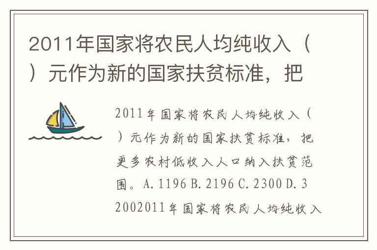 2011年国家将农民人均纯收入()元作为新的国家扶贫标准,把更多农村低收入人口纳入扶贫范围。A.1196 B.2196 C.2300 D.3200