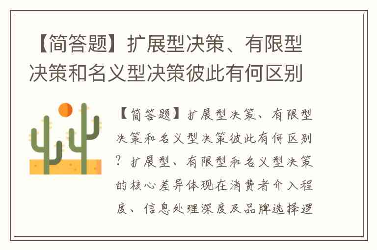 扩展型、有限型和名义型决策的核心差异体现在消费者介入程度、信息处理深度及品牌选择逻辑上。美国学者恩格尔提出的这一分类框架,揭示了从“谨慎比较”到“下意识重复”的购买心理梯度。