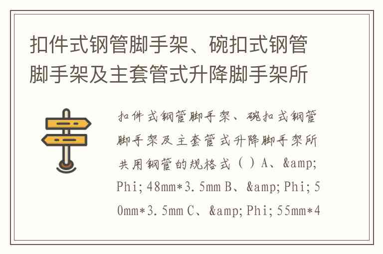 扣件式钢管脚手架、碗扣式钢管脚手架及主套管式升降脚手架所共用钢管的规格式()A、Φ48mm*3.5mm B、Φ50mm*3.5mm C、Φ55mm*4.5mm D、Φ48mm*2.2mm