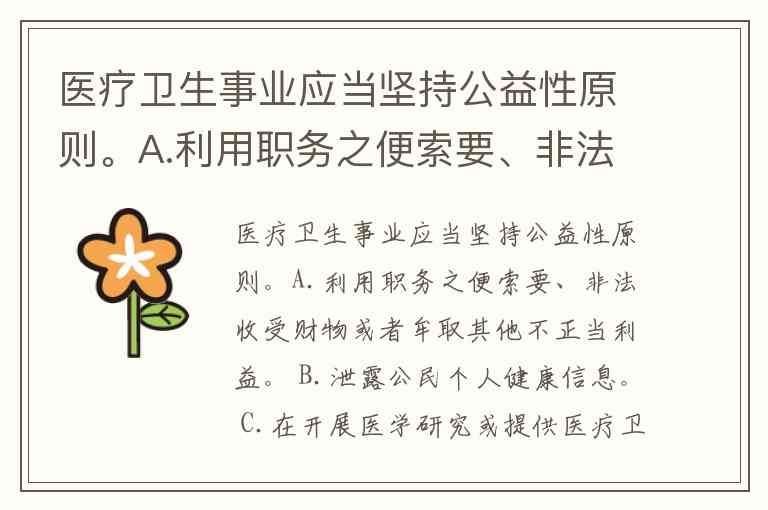 医疗卫生事业应当坚持公益性原则。A.利用职务之便索要、非法收受财物或者牟取其他不正当利益。 B.泄露公民个人健康信息。 C.在开展医学研究或提供医疗卫生服务过程中未按照规定履行告知义务或者违反医学伦理规范。 D.医疗卫生机构对外出租、承包医疗科室。