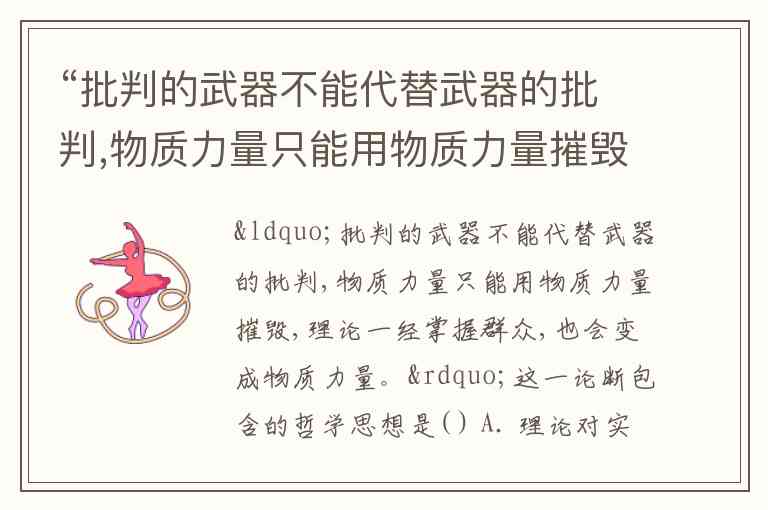 “批判的武器不能代替武器的批判”强调物质世界的改造必须依赖物质力量。这里的“批判的武器”指思想理论层面的批判,“武器的批判”则是实践层面的行动。正如文档中反复阐释的,理论再深刻也无法直接替代具体实践,例如“纸上谈兵不能建成社会主义,必须付诸实践”。这直接对应选项B(理论不能代替实践)。