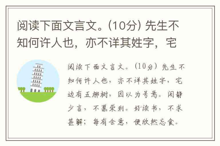 阅读下面文言文。(10分) 先生不知何许人也,亦不详其姓字,宅边有五柳树,因以为号焉。闲静少言,不慕荣利。好读书,不求甚解;每有会意,便欣然忘食。性嗜酒,家贫不能常得。亲旧知其如此,或置酒而招之;造饮辄尽,期在必醉。既醉而退,曾不吝情去留。环堵萧然,不蔽风日;短褐穿结,箪瓢屡空,晏如也。常著文章自娱,颇示己志。忘怀得失,以此自终。 赞曰:黔娄之妻有言:“不戚戚于贫贱,不汲汲于富贵。”其言兹若人之俦乎?衔觞赋诗,以乐其志。无怀氏之民欤?葛天氏之民欤?(选自陶渊明《五柳先生传》) 小题1:下列句子中加点词的意思相同的一项是( )(3分) A.先生不知何许人也 B.或置酒而招之 遂许以驱驰(《出师表》)或遇其叱咄,色愈恭(《送东阳马生序》) C.箪瓢屡空,晏如也。 D.宅边有五柳树,因以为号焉。 如使人之所欲莫甚于生(《鱼我所欲也》) 高祖 因之以成帝业 (《隆中对》) 小题2:将下列两个句子翻译成现代汉语。(4分) (1)不戚戚于贫贱,不汲汲于富贵。(2)环堵萧然,不蔽风日。 小题3:下列对文章内容的理解,不正确的一项是( )(3分) A.先生别号“五柳”,缘于屋旁的五棵柳树。 B.先生酷爱读书,常常不放过一字一句。 C.先生生活贫穷,缺吃少穿,却时常以文自娱。 D.先生志趣独特,从不把世俗的得失放在心上。