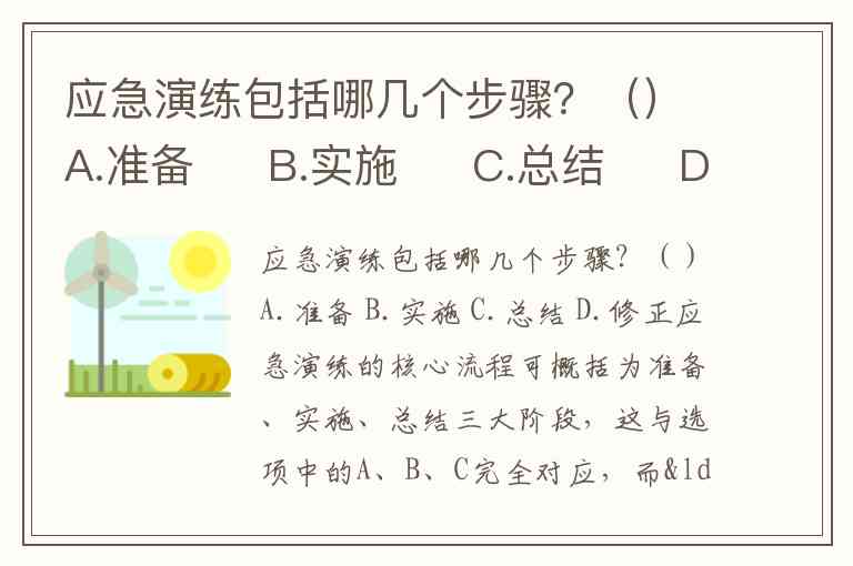 应急演练的核心流程可概括为准备、实施、总结三大阶段,这与选项中的A、B、C完全对应,而“修正”属于总结后的持续改进环节,并非独立步骤。以下是基于权威流程的详细解析: