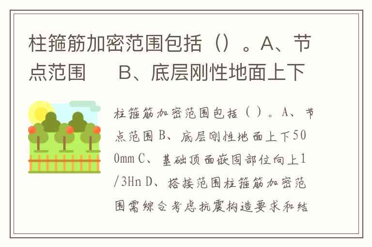 柱箍筋加密范围需综合考虑抗震构造要求和结构受力特性,根据《混凝土结构设计规范》(GB 50010)及11G101-1、22G101-1等图集,选项A、B、C、D均属于加密范围。具体来说:节点范围是力传递的关键区域,箍筋加密可增强节点核心区抗剪能力;底层刚性地面上下各500mm加密能抵抗地面变形对柱根的影响;基础顶面嵌固部位向上1/3Hn(柱净高)加密则针对底层柱根的薄弱环节;而搭接范围内加密是为了约束钢筋搭接接头的变形。