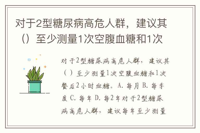 对于2型糖尿病高危人群,建议其()至少测量1次空腹血糖和1次餐后2小时血糖。A.每月 B.每季度 C.每年 D.每2年