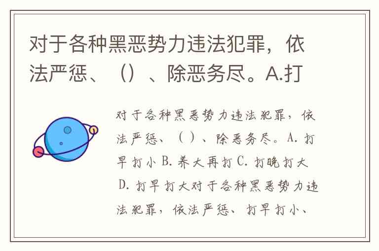 对于各种黑恶势力违法犯罪,依法严惩、()、除恶务尽。A.打早打小 B.养大再打 C.打晚打大 D.打早打大