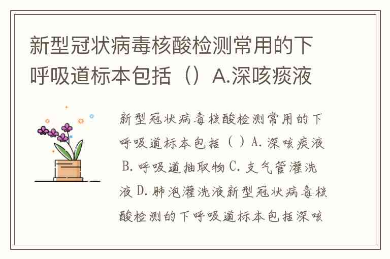 新型冠状病毒核酸检测常用的下呼吸道标本包括()A.深咳痰液 B.呼吸道抽取物 C.支气管灌洗液 D.肺泡灌洗液