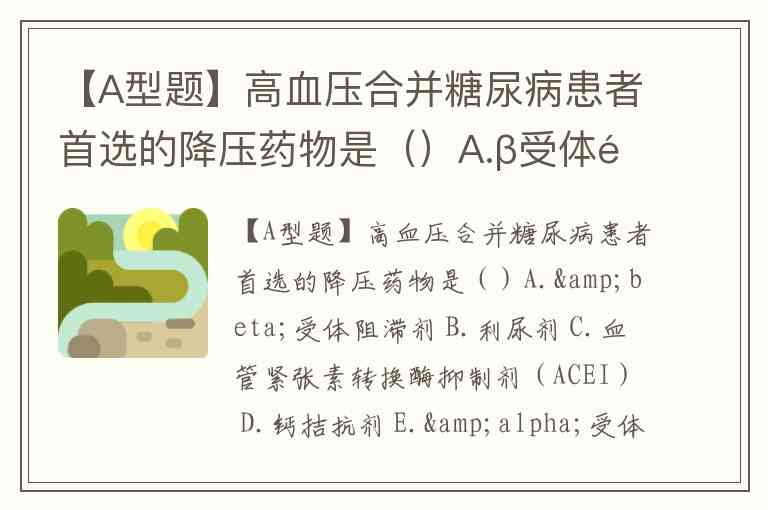 【A型题】高血压合并糖尿病患者首选的降压药物是()A.β受体阻滞剂 B.利尿剂 C.血管紧张素转换酶抑制剂(ACEI) D.钙拮抗剂 E.α受体阻滞剂