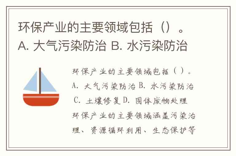 环保产业的主要领域包括()。A. 大气污染防治 B. 水污染防治 C. 土壤修复 D. 固体废物处理