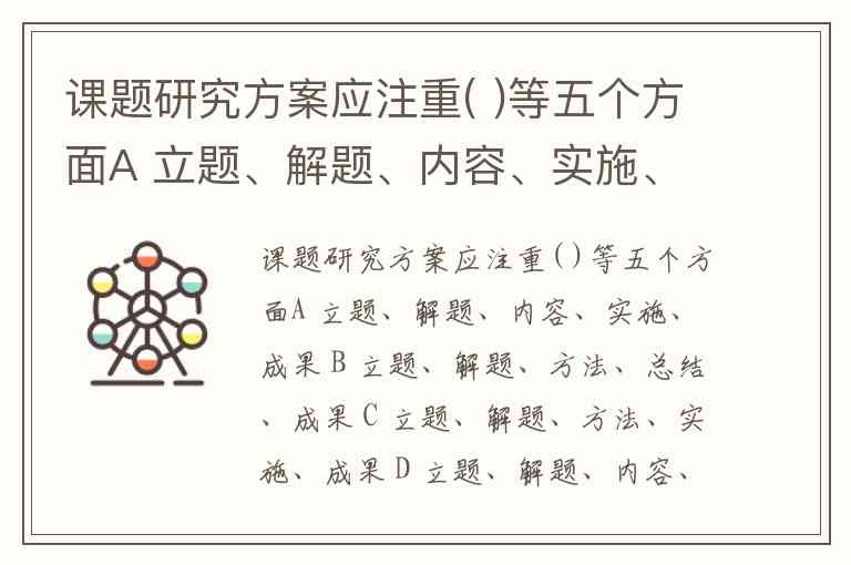 课题研究方案应注重( )等五个方面A 立题、解题、内容、实施、成果 B 立题、解题、方法、总结、成果 C 立题、解题、方法、实施、成果 D 立题、解题、内容、总结、成果