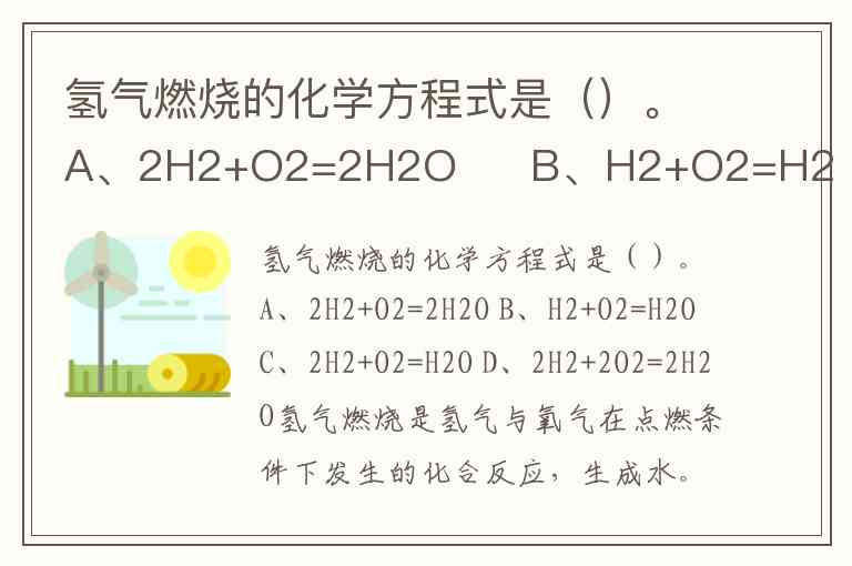 氢气燃烧的化学方程式是()。A、2H2+O2=2H2O B、H2+O2=H2O C、2H2+O2=H2O D、2H2+2O2=2H2O
