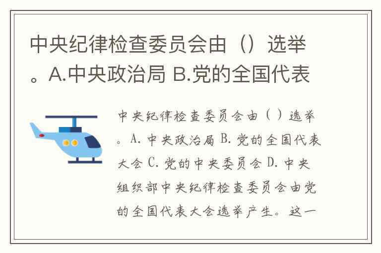 中央纪律检查委员会由()选举。A.中央政治局 B.党的全国代表大会 C.党的中央委员会 D.中央组织部