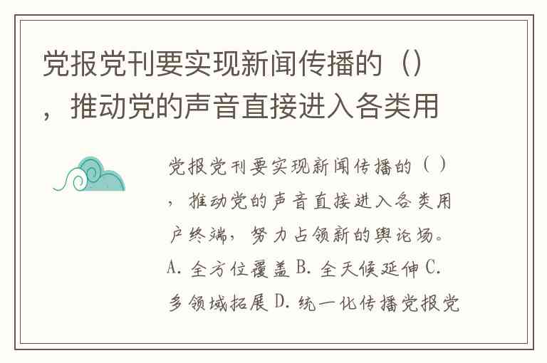 党报党刊要实现新闻传播的(),推动党的声音直接进入各类用户终端,努力占领新的舆论场。A.全方位覆盖 B.全天候延伸 C.多领域拓展 D.统一化传播