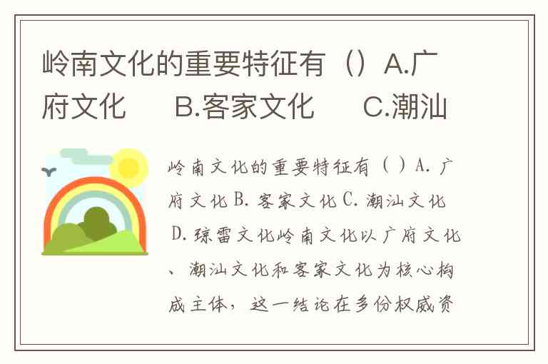 岭南文化的重要特征有()A.广府文化 B.客家文化 C.潮汕文化 D.琼雷文化