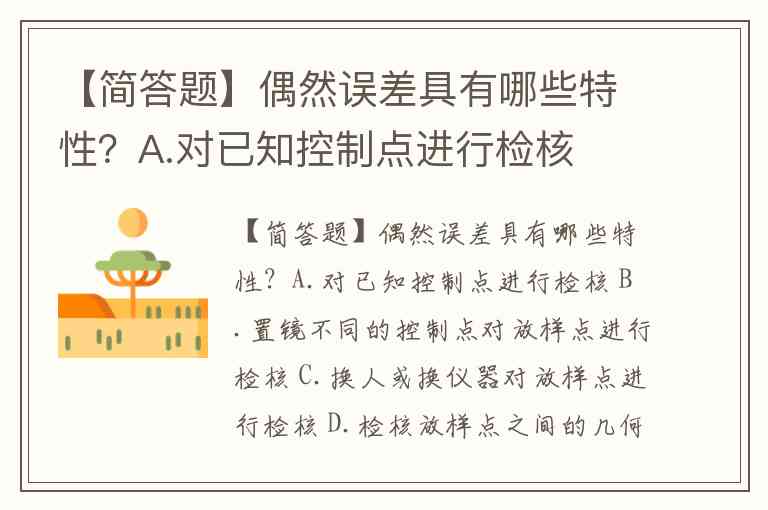 【简答题】偶然误差具有哪些特性?A.对已知控制点进行检核 B.置镜不同的控制点对放样点进行检核 C.换人或换仪器对放样点进行检核 D.检核放样点之间的几何尺寸
