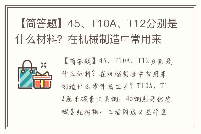 T10A、T12属于碳素工具钢,45钢则是优质碳素结构钢,三者因成分差异呈现不同性能,在机械制造中各司其职。