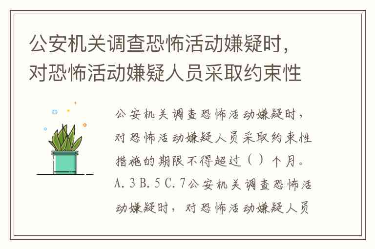公安机关调查恐怖活动嫌疑时,对恐怖活动嫌疑人员采取约束性措施的期限不得超过()个月。A.3 B.5 C.7