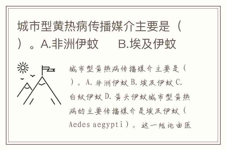 城市型黄热病传播媒介主要是()。A.非洲伊蚊 B.埃及伊蚊 C.白纹伊蚊 D.黄头伊蚊