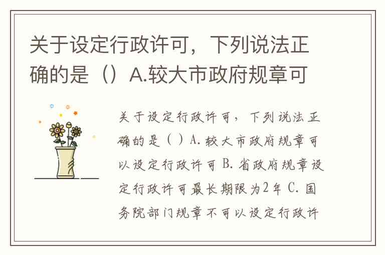关于设定行政许可,下列说法正确的是()A.较大市政府规章可以设定行政许可 B.省政府规章设定行政许可最长期限为2年 C.国务院部门规章不可以设定行政许可 D.省政府规章不可以设定行政许可