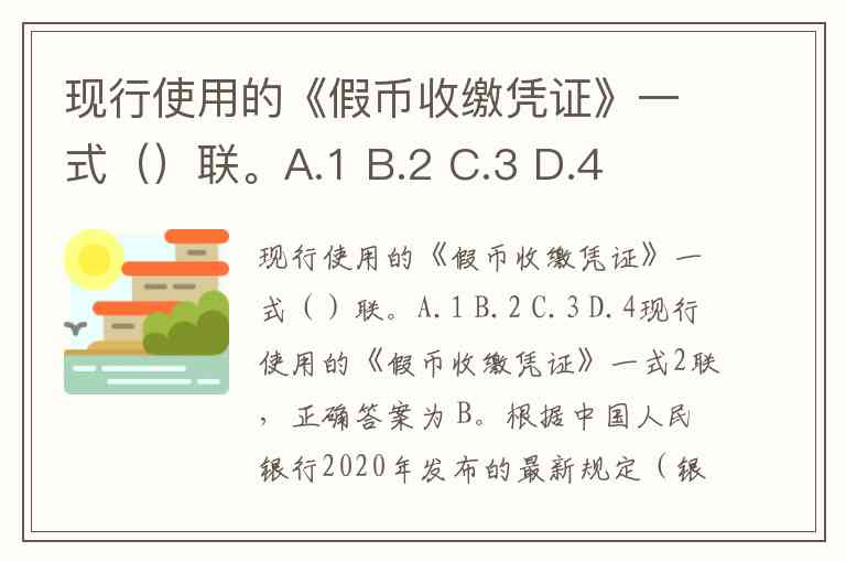 现行使用的《假币收缴凭证》一式2联,正确答案为 B。根据中国人民银行2020年发布的最新规定(银发〔2020〕281号),该凭证一式二份,收缴单位和被收缴人各持一份,且需在盖章处加盖收缴单位业务公章。这一规范明确统一了凭证联次,取代了此前“一式三联”或“根据情况分为两联/三联”的做法。