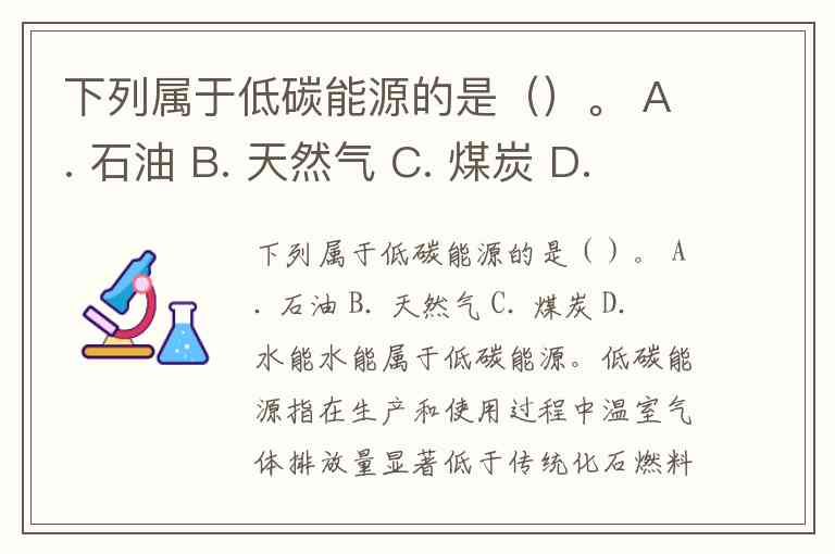 下列属于低碳能源的是()。 A. 石油 B. 天然气 C. 煤炭 D. 水能