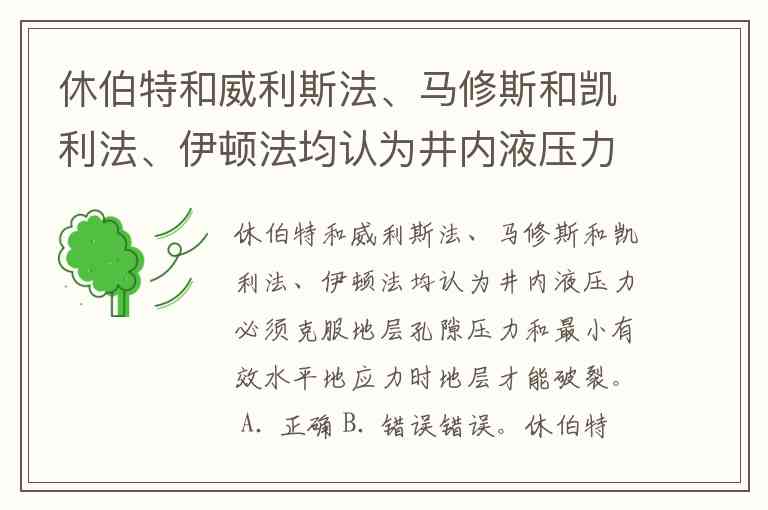 错误。休伯特和威利斯法、马修斯和凯利法、伊顿法均未同时要求液压力克服地层孔隙压力()和最小有效水平地应力()。根据经典水力压裂理论,地层破裂需满足井壁应力平衡方程,核心是液压力需克服最小水平主应力与岩石抗拉强度之和,孔隙压力通过有效应力原理间接影响而非直接作为独立克服对象。