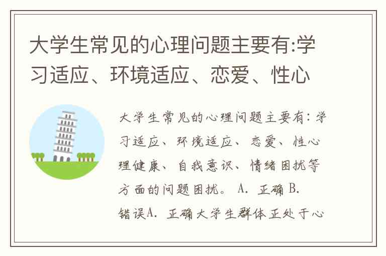 大学生常见的心理问题主要有:学习适应、环境适应、恋爱、性心理健康、自我意识、情绪困扰等方面的问题困扰。 A. 正确 B. 错误
