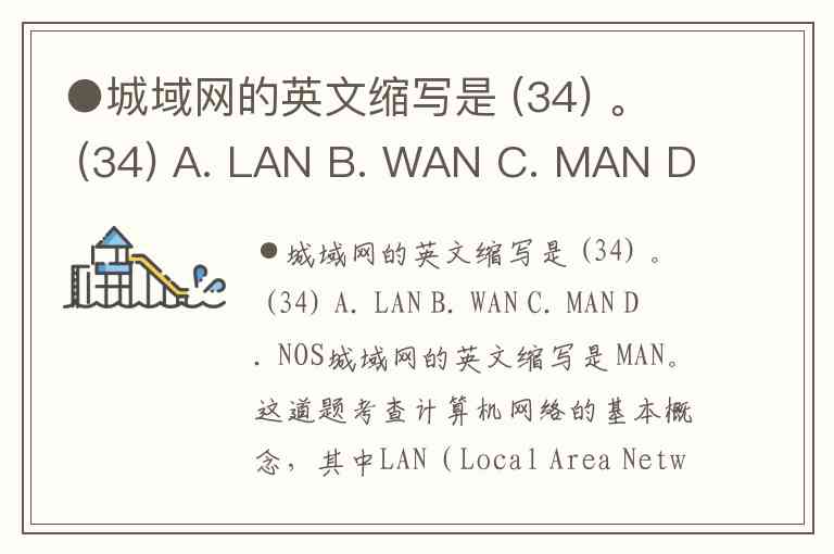 ●城域网的英文缩写是 (34) 。 (34) A. LAN B. WAN C. MAN D. NOS
