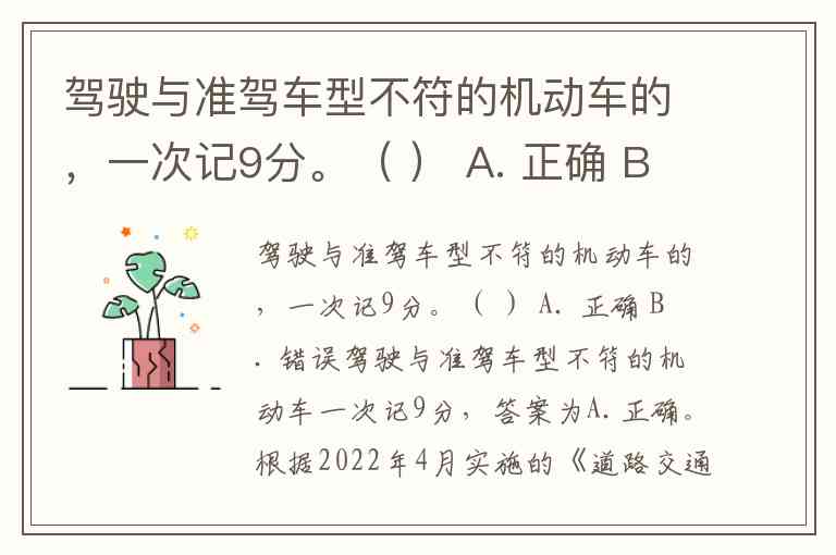 驾驶与准驾车型不符的机动车的,一次记9分。( ) A. 正确 B. 错误