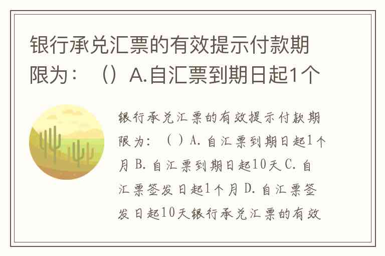 银行承兑汇票的有效提示付款期限为:()A.自汇票到期日起1个月 B.自汇票到期日起10天 C.自汇票签发日起1个月 D.自汇票签发日起10天