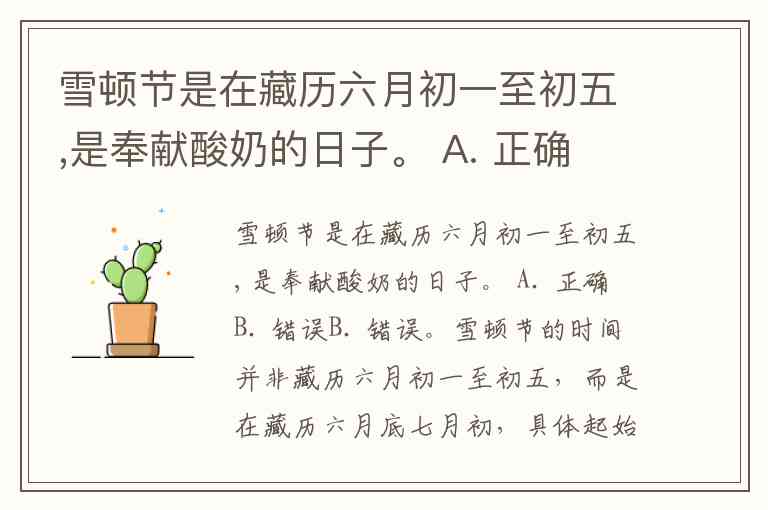 雪顿节是在藏历六月初一至初五,是奉献酸奶的日子。 A. 正确 B. 错误