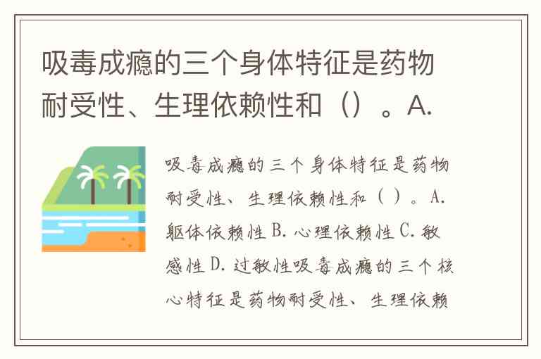 吸毒成瘾的三个身体特征是药物耐受性、生理依赖性和()。A.躯体依赖性 B.心理依赖性 C.敏感性 D.过敏性