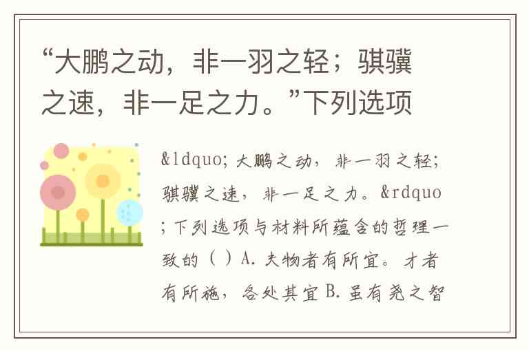 “大鹏之动,非一羽之轻;骐骥之速,非一足之力。”下列选项与材料所蕴含的哲理一致的()A.夫物者有所宜。才者有所施,各处其宜 B.虽有尧之智而无众人之助,大功不立 C.为政以德,譬如北辰,居其所而众星拱之 D.夫君子取情而去貌,好质而恶饰