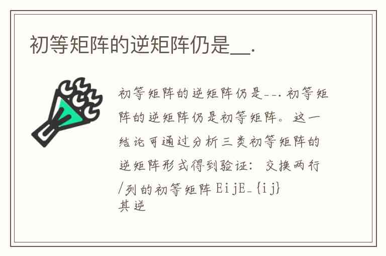 初等矩阵的逆矩阵仍是初等矩阵。这一结论可通过分析三类初等矩阵的逆矩阵形式得到验证: