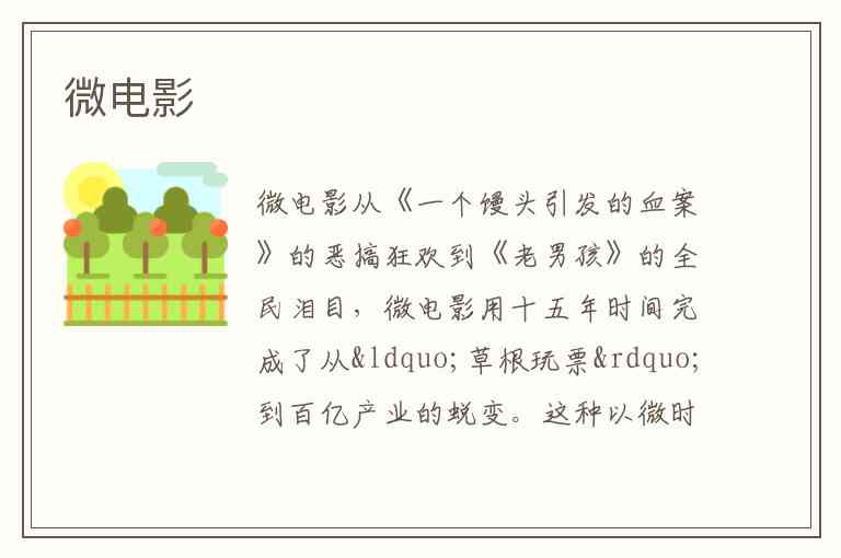 从《一个馒头引发的血案》的恶搞狂欢到《老男孩》的全民泪目,微电影用十五年时间完成了从“草根玩票”到百亿产业的蜕变。这种以微时长(30秒-300秒)、微周期(最长制作周期不超过一个月)、微投资(成本从数万元到几十万元不等) 为核心特征的影视形式,正以手机为摄像机、以社交媒体为院线,重塑着内容创作的边界。2024年中国微电影年产量已突破10万部,预计2030年市场规模将达200亿元,成为文化产业不可忽视的新势力。