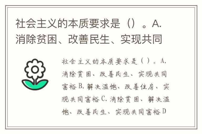 社会主义的本质要求是()。A.消除贫困、改善民生、实现共同富裕 B.解决温饱、改善住房、实现共同富裕 C.消除贫困、解决温饱、改善民生、实现共同富裕 D.消除贫困、解决温饱、改善住房、实现共同富裕