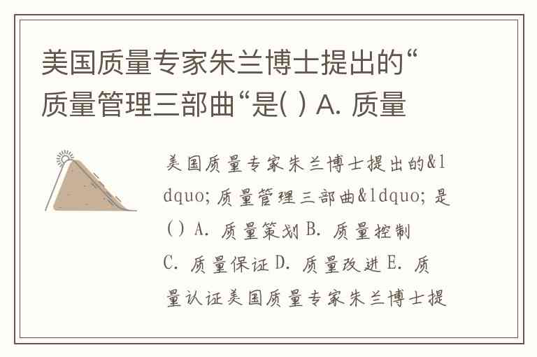 美国质量专家朱兰博士提出的“质量管理三部曲“是( ) A. 质量策划 B. 质量控制 C. 质量保证 D. 质量改进 E. 质量认证