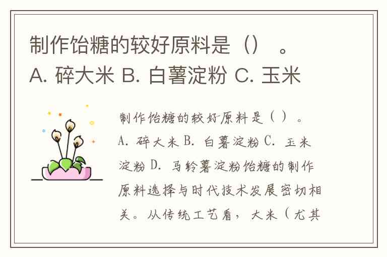 制作饴糖的较好原料是() 。 A. 碎大米 B. 白薯淀粉 C. 玉米淀粉 D. 马铃薯淀粉