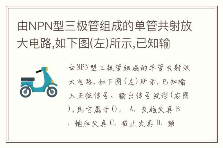 由NPN型三极管组成的单管共射放大电路,如下图(左)所示,已知输入正弦信号、输出信号波形(右图),则它属于()。 A. 交越失真 B. 饱和失真 C. 截止失真 D. 频率失真