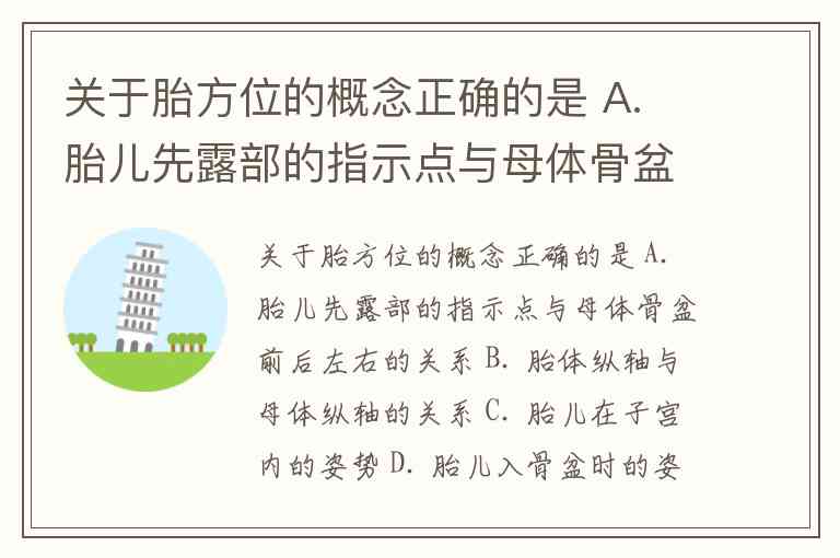 关于胎方位的概念正确的是 A. 胎儿先露部的指示点与母体骨盆前后左右的关系 B. 胎体纵轴与母体纵轴的关系 C. 胎儿在子宫内的姿势 D. 胎儿入骨盆时的姿势