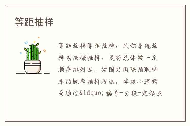 等距抽样,又称系统抽样或机械抽样,是将总体按一定顺序排列后,按固定间隔抽取样本的概率抽样方法。其核心逻辑是通过“编号-分段-定起点-等距抽取”四步实现高效抽样,兼具随机性与系统性,在市场调研、质量检测等领域应用广泛。