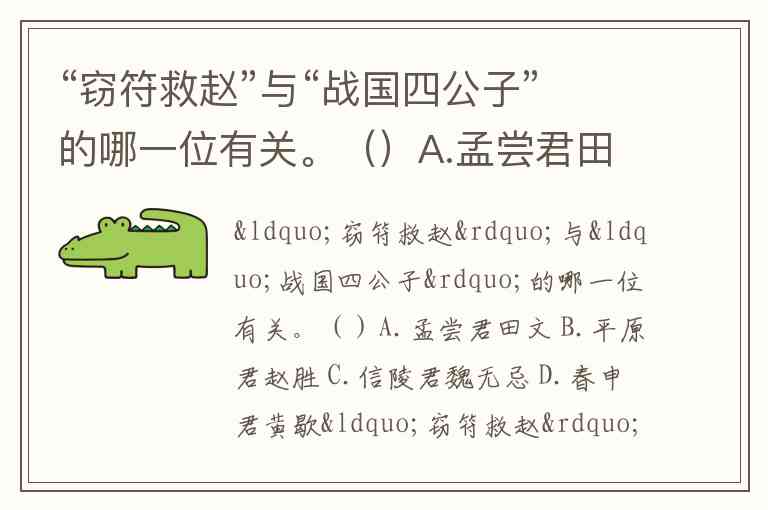 “窃符救赵”与“战国四公子”的哪一位有关。()A.孟尝君田文 B.平原君赵胜 C.信陵君魏无忌 D.春申君黄歇