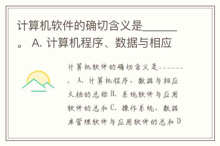 计算机软件的确切含义是______。 A. 计算机程序、数据与相应文档的总称 B. 系统软件与应用软件的总和 C. 操作系统、数据库管理软件与应用软件的总和 D. 各类应用软件的总称