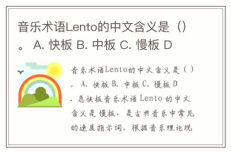 音乐术语Lento的中文含义是()。 A. 快板 B. 中板 C. 慢板 D. 急快板